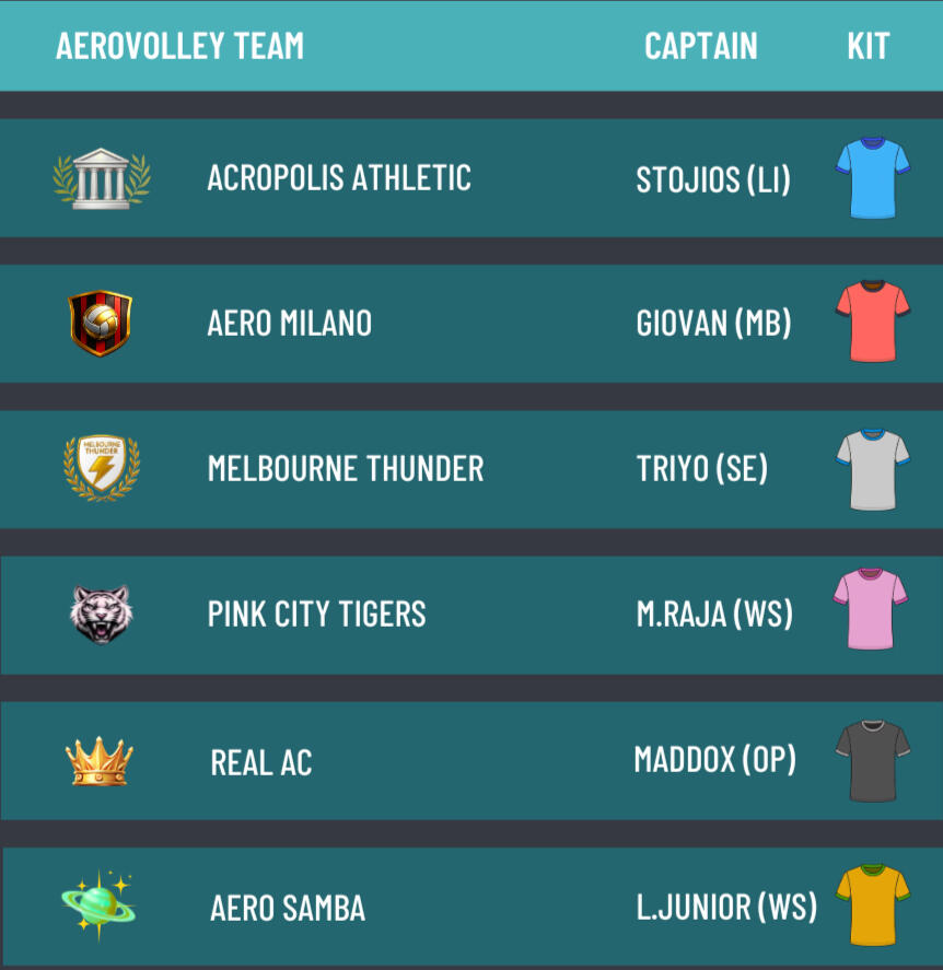 -> Acropolis Athletic, Aero Milano, Melbourne Thunder, Pink City Tigers, Aero Samba and Real AC.Aerovolley College Games
